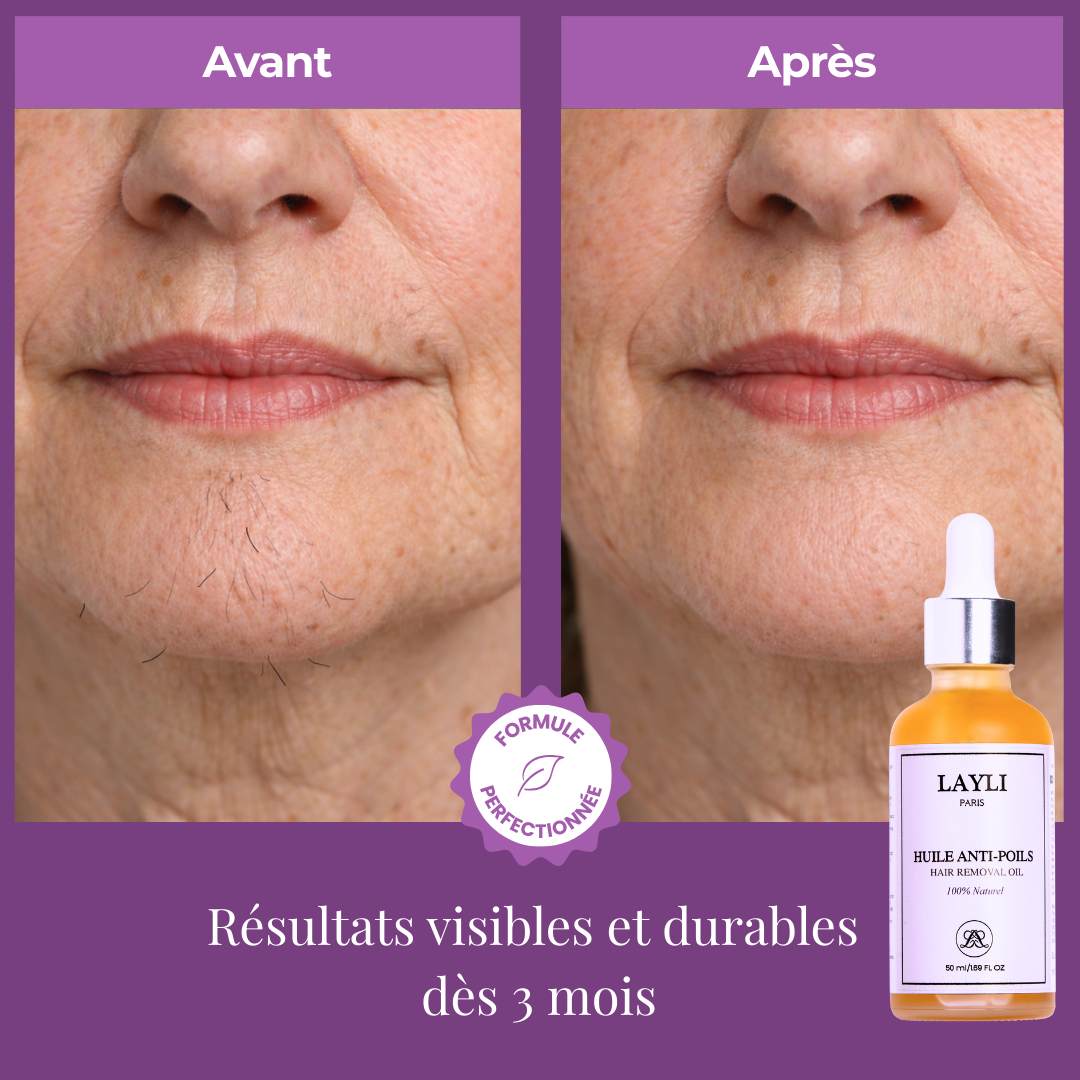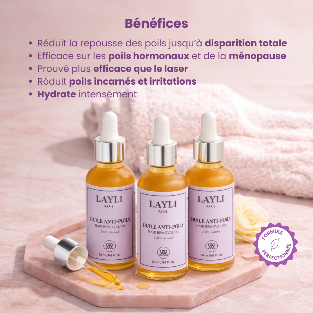 Prouvé plus efficace que le laser, LAYLI vous libère des poils grâce à notre huile végétale prisée, souvent en rupture de stock. Dites bye bye à l'épilation et aux coûts élevés des séances.